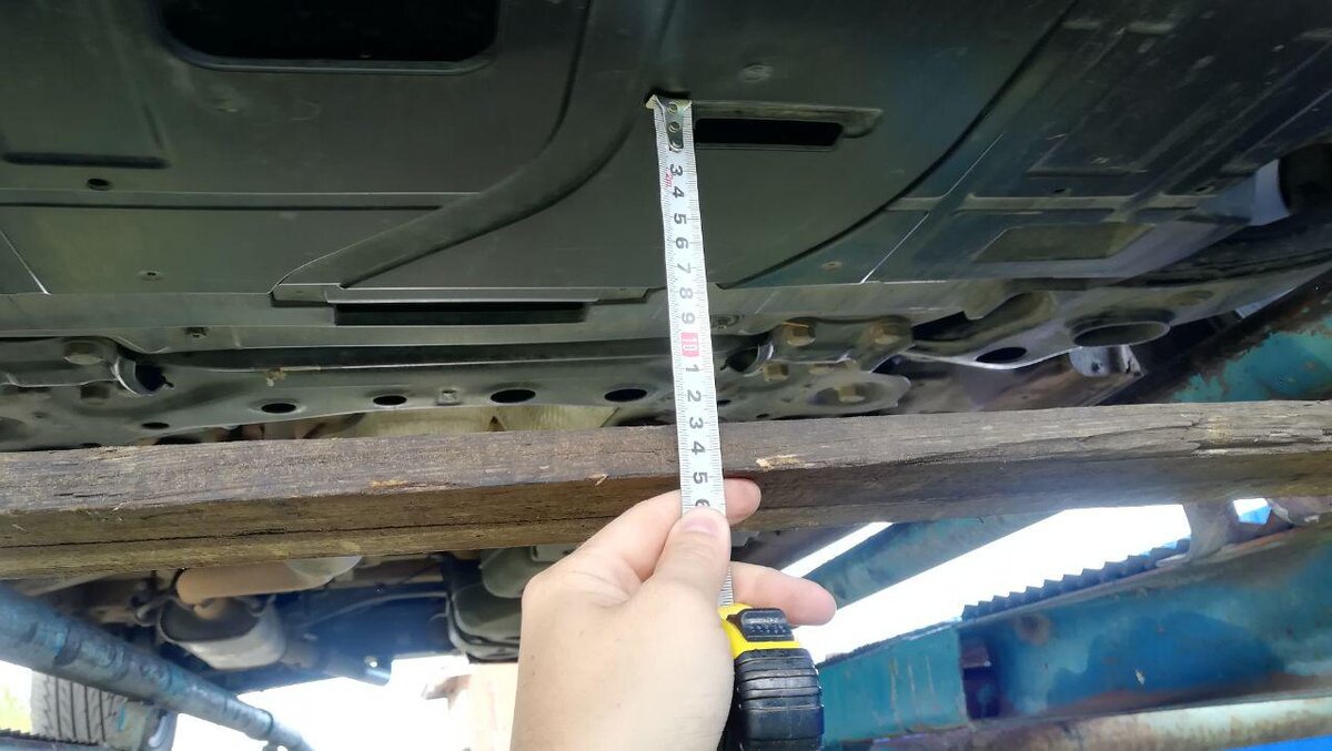 По паспорту у Джили Атлас дорожный просвет равняется 190 мм. Это при снаряженной массе. У загруженной машины клиренс, естественно, будет на пару сантиметров меньше. Но стоит ли верить паспортным данным? Ведь как показывает расход топлива, то, что на бумаге, и то, что получается в реальной жизни, это две большие разницы. Я решил проверить клиренс довольно примитивным способом. Загнал машину на эстакаду, подложил между колесами доску, взял рулетку и померил расстояние от защиты до нижнего края доски. Получилось почти 150 мм. На четыре сантиметра меньше, чем обещали. Что это развод, обман, китайская хитрость? На самом деле во всем виновата защита картера. Если померить расстояние от защиты до самого картера, получатся те самые недостающие 4 см. Даже немножко больше. В общем, всё по-честному. Вот только мало кто в России ездит без защиты, так что на клиренс 190 мм рассчитывать не стоит. Впрочем, если это может быть утешением, такая же ситуация у всех машин. И у Креты, и у легковушек. Толь