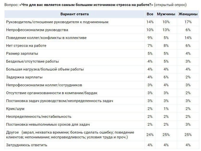 Большинство россиян (90%) горят от стресса на работе, только 7% живут в гармонии с собой и окружением. Больше всех раздражает респондентов опроса Superjobs начальники (14%) и их непрофессионализм (10%). Надо больше отдыхать, господа и дамы, это не дело.