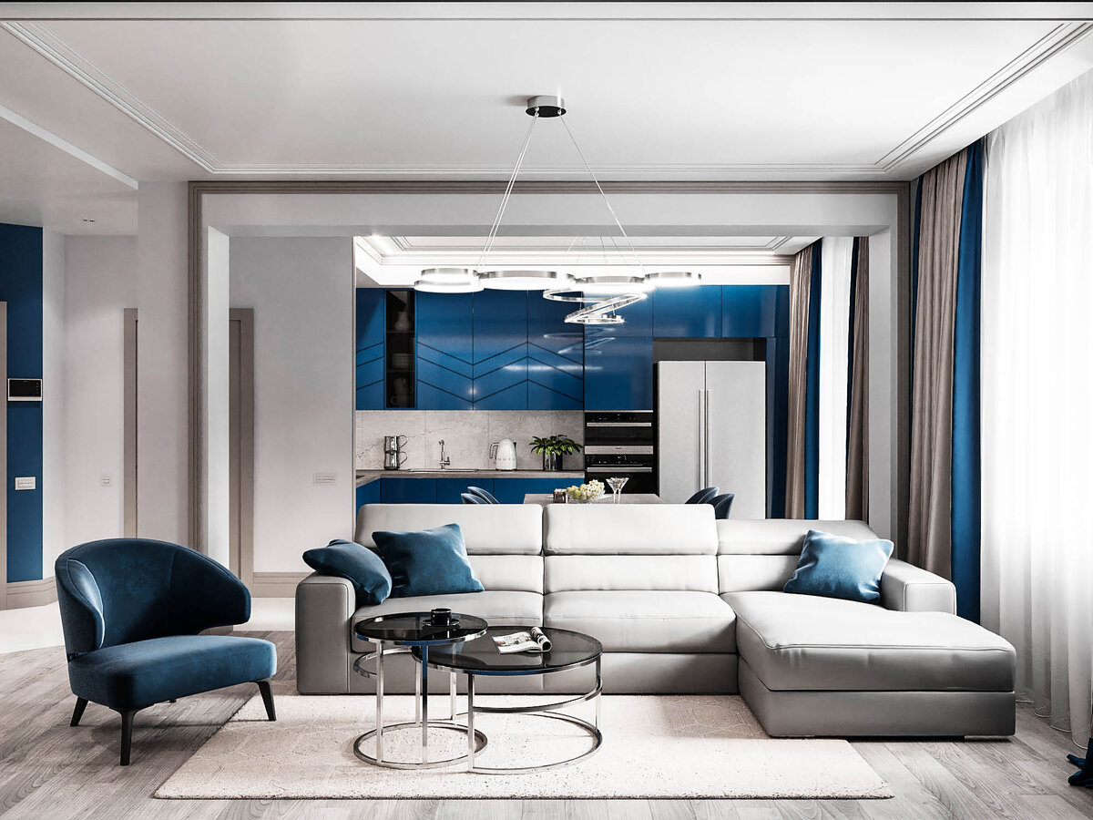 Сохранение свободного пространства – повсеместный тренд в оформлении современных интерьеров. Поэтому даже в просторных квартирах объединяют разные по назначению помещения в одну зону. За стенами остаётся только личное, сокровенное: спальни, детские комнаты, места уединения и отдыха. Проект квартиры площадью 90,9 кв.м доказывает: не обязательно возводить стены и разделять пространство углами. Всё решают контрасты, цветовая схема и интерьерные находки. Кухня/прихожая/гостиная: В этом проекте прихожая стала частью гостиной: небольшой встроенный шкаф напротив входа приглашает раздеться и сразу окунуться в уют домашней обстановки. Меньше стен и дверей – больше воздуха и простора. Гостиная визуально отделена большим диваном и разноуровневым потолком, а так же контрастным напольным покрытием. Для того, чтобы определить границы, достаточно сделать намёк на их присутствие. Объединённое пространство всегда нуждается в хорошем естественном освещении. В данном случае источников свет