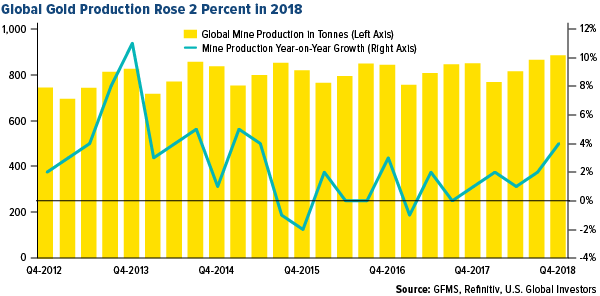 Хотя производство упало на 4% третий год подряд, Мексика остается конкурентоспособным добытчиком золота. Объем производства вырос с 50,8 тонн в 2008 году до более чем 130 тонн в 2017 году, что является одним из самых больших показателей за девять лет. Мексика является привлекательным местом для добычи полезных ископаемых из-за относительно низкой стоимости регулирования.