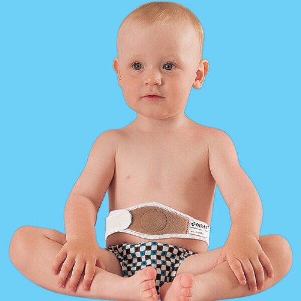 Некоторые врачи рекомендуют специальные бандажи или детские медицинские пояса, но если ребенок ползает – эти приспособления могут сползать, поэтому эти методы применяют реже, чем повязки из специальных лейкопластырей.