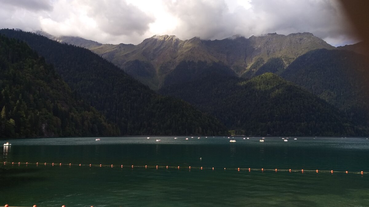 Продолжаю свой рассказ о поездке на озеро Рица. Оно конечно обалденное. Долго подбирала слово, но по-другому и не скажешь. Конечно фото не передает всей красоты - лучше съездить и увидеть все своими глазами. С данного ракурса озеро полностью не видно, оно поворачивает за горы. Что из развлечений на озере - конечно многочисленные сувенирные лавки. Водные развлечения - лодки, катамараны и катерочки. Мы покатались на катамаране (400 р за двоих на 30 мин). Многочисленные кафе и столовые с национальной едой. Вот тут интересный момент - чем выше идешь в гору - тем дороже кафе.А мы-то думали по-другому. В результате - переплатили. Основное в меню - это набор - мамалыга + кусочки сыра + соус + мясо + лодочка с яйцом. Все очень вкусное и из-за огромного потока покупателей - все очень свежее. Еще можно заказать шашлык, рыбу, различные супы, гарниры, выпечка и конечно вино, коньяк, чача и безалкогольные напитки. Отдохнули чудесно! И уже собирались уезжать с парковки (она кстати бесплатная - но!