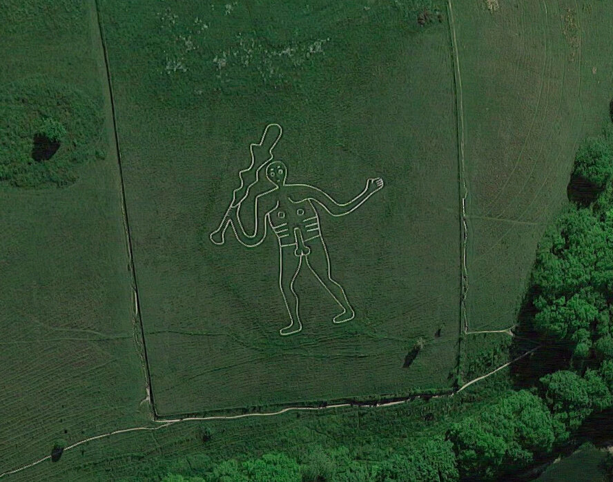 Координаты: 50.813661, -2.474783 Деревня Серн Аббас, графство Дорсет, Великобритания Гигантская меловая фигура обнажённого мужчины имеет размеры в 55 метров в высоту и 51 метр в ширину. Фигура выведена на холме траншеей в 30 сантиметров в ширину и примерно такой же глубины, которая была проделана по траве и земле, в результате чего стал виден мел. В правой руке гигант держит палицу. Исследование в 1996 году показало, что некоторые черты фигуры изменились с течением времени — гигант изначально имел плащ, наброшенный на его левую руку. Происхождение фигуры и её возраст неизвестны. Ранние исследователи связывали её с саксонским божеством, хотя никаких доказательств этого не существует. Другие учёные пытались определить её как фигуру, изображающую какое-либо божество бриттов, или римского Геркулеса. В 1996 году исследование укрепило идентификацию с Гераклом, который часто изображается с палицей и наброшенным на руку плащом, сделанным из шкуры Немейского льва. Первые упоминания о фигуре по