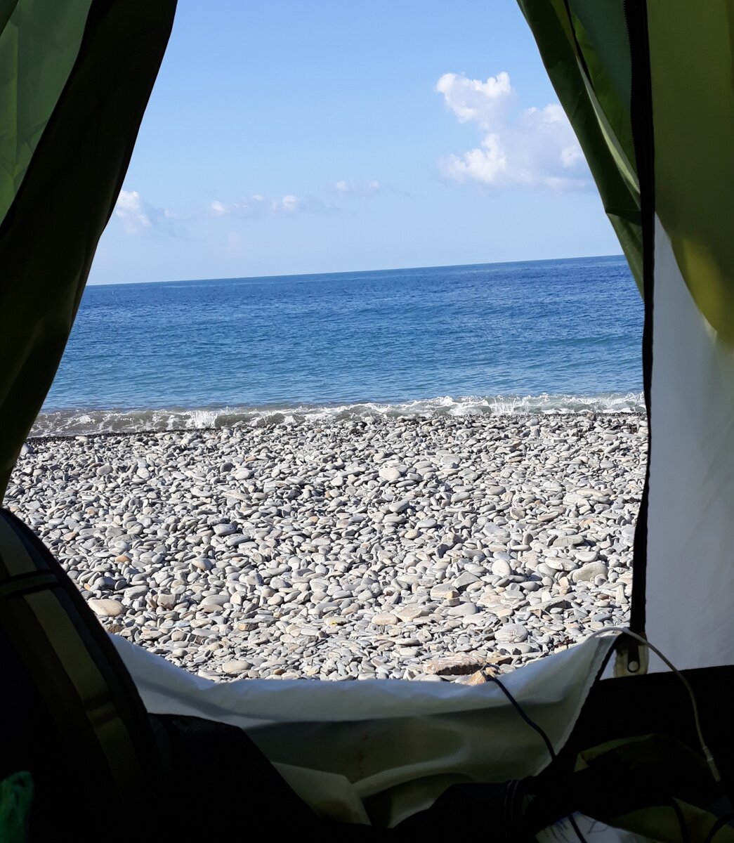 День 2. Спалось не очень, пляж в утрише крупная галька и острые камни по всему берегу. В общем бока с непривычки болят и спал от силы часа 4. Ночью где то была гроза, я только вспышки молнии наблюдал. Вылез из палатки где то часов в 7 утра и отправился на поиски воды. Народ сказал где то есть типа источник, родник. Нашёл но вода оказалась не питьевая, сероводорода говорят много. Решил сходить в магазин купить. Хорошо магазин рядом. Зашёл, набрал еды и спросил можно ли у них набрать питьевой воды. Вообще без проблем налили. Думал на день остаться в утрише, нога как то сильно болела. Ещё раз промыл рану, замазал БФ клеем. Позавтракал горбушу консервированную, сыр и пару булочек с Москвы остатки. Что то так раскимарило и прилёг в теньке дремануть. Очнулся в час дня от того что тень кончилась. Солнце в зените, тени исчезают почти. Нога болеть меньше стала, значит нужно ехать. Собрал все вещи и поехал через государственный природный заповедник Утриш. Выехал в 13.20. Дорога предстояла ч