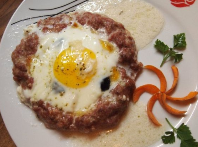 Необходимые продукты 1 кг фарша тмина / перец соль 6 яиц 200 г грибов. Для соуса: 300 мл. свежего молока 50 г плавленого сыра 2 ст. л муки соль 1 кофейная чашка белого вина 1 кусок сливочного масла МЕТОД ГОТОВКИ Фарш со специями и два яйца хорошо перемешать. В промасленной сковороде образуются 4 крупных фрикадельки, в середине которых образуются ямки - гнезда. Вставьте в каждое гнездо небольшое количество ветчины и грибов. Его готовят до готовности фарша, затем в каждую лунку вбивают одно яйцо и снова запекают. Другие продукты готовятся с соусом, который при желании добавляют.