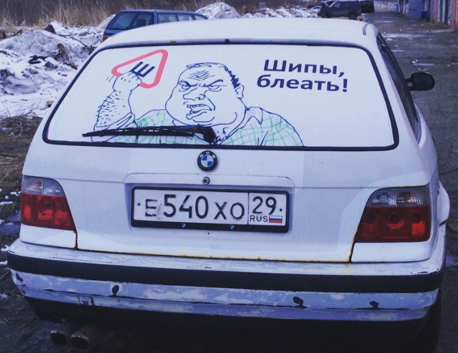 Полюбившая всем читателям рубрика, поэтому я выпускаю очередную часть. Уже седьмую! Здесь я собирая самые интересные и веселые надписи на автомобилях. Некоторые просто анекдотичны. Предыдущие выпуски можно посмотреть по ссылкам в конце этой статьи👇. Приятного просмотра. Поехали! 1. Шипы. Повесить обычный значок на заднее стекло? Неееет, это слишком скучно для творческих людей, которые любят мемасики из интернета. Теперь вот во всё стекло такая вот картина. Ну и что, что в это стекло теперь ничего не видно, зато все знаю, что ты на шипованной резине. Да и ночью фарами в заднее стекло никто не ослепит. 2. Полезные советы. Курение - это очень плохая привычка. А уж тем более, если курит девушка. Но вот владелец этого автомобиля знает, чем можно заменить сигареты. Да и для здоровье это совсем не вредно. А может быть даже и полезно. Осталось только изучить русский язык. 3. Долги надо отдавать. Даже если они карточные. Но иногда этот долг может еще кое-чему научить и сделать мастером своего