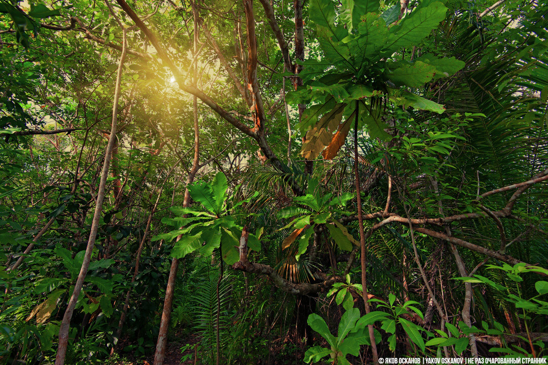 Блин, ну вот не тюленится мне более двух дней. Не могу лежать на пляже и смотреть как 100500 оттенков бирюзового океана плавно перетекают в 100500 оттенков лазоревого неба. И даже если добавить к этому белоснежный песок, поскрипывающий как снег под ногами, шелест пальмовых листьев, и капельки, бегущие по запотевшему стакану мохито, то всё равно не удержать меня на пляже. Ну, вот не моё это. Не был я в прошлой жизни ни тюленем, ни моржом, ни даже самой завалящей нерпой. Махнул на всё рукой и уехал в джунгли. Семья и друзья недоуменно смотрели мне вслед. А вы знаете, что слово "джунгли" не является научным термином? На самом деле учёные говорят "дождевые леса" или там, "галерейные леса", или "влажные облачные леса". "Джунгли" не говорят. Слово "джунгли" попало в европейские языки из Индии, и происходит от санскритского слово "джангала", которым обозначали невозделанные земли. По сути джунгли – просто непроходимые заросли. Для меня самым интересном местом на острове является тропический