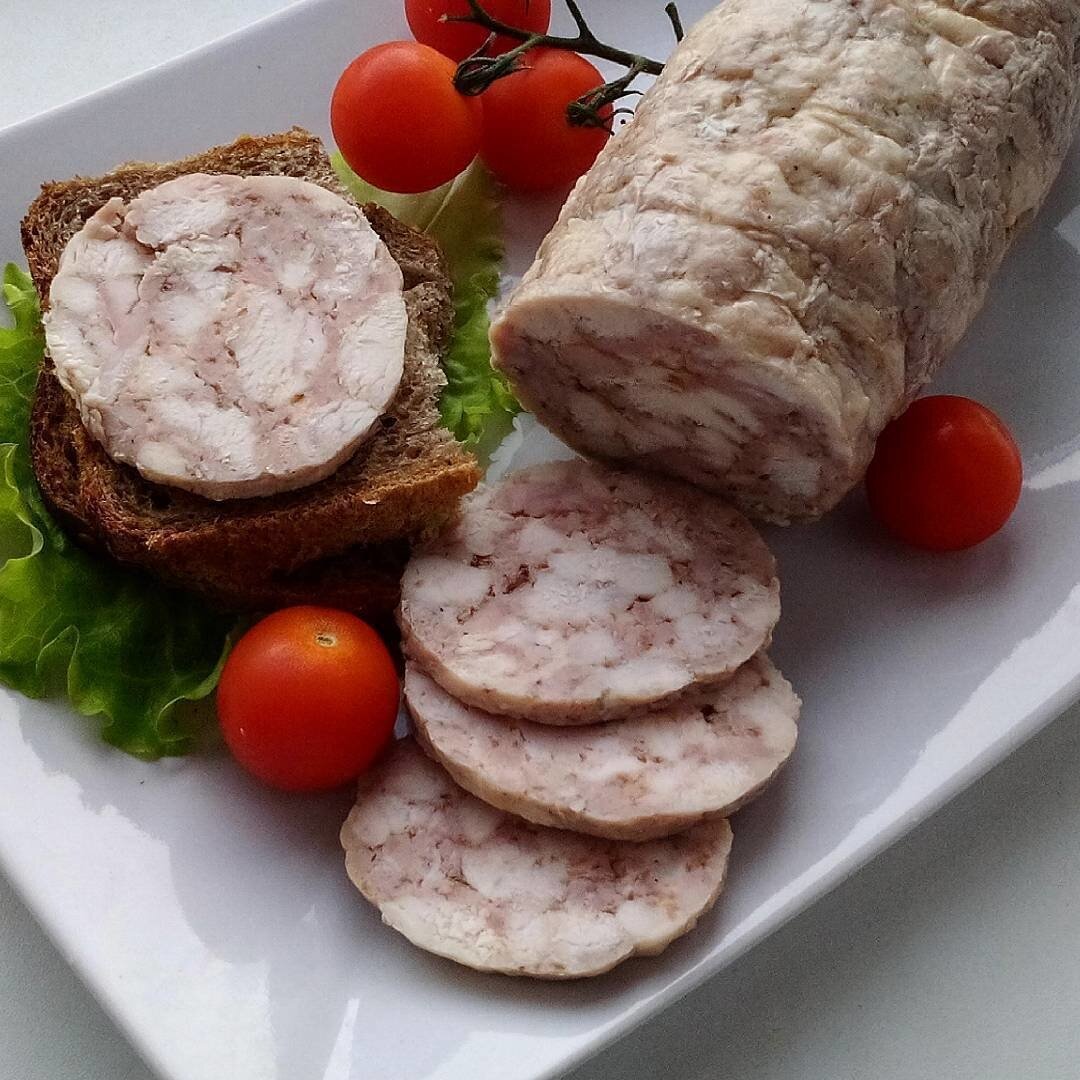 Перед приготовлением добавить желатин и хорошо всё перемешать. Выложить фарш в рукав для запекания и сформировать колбаску желаемой толщины, при этом хорошо уплотнить мясо. Равномерно туго обмотать ниткой или использовать медицинский эластичный сетчато- трубчатый бинт (у меня номер 4). Отпустить в кипящую воду и варить на среднем огне в слегка приоткрытой кастрюле 45-60 минут. Достать и оставить до полного остывания. Удобно приготовить на ночь и утром наслаждаться вкусным завтраком