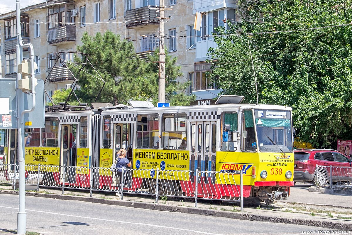 Сегодняшний обзор о рельсовом транспорте, но не междугороднем, а городском. И как понятно из заголовка речь пойдет о трамвае города Евпатория. Евпаторийский трамвай - один из самых старых в стране, а еще он - узкоколейный! Ширина колеи (то есть расстояние между рельсами) всего 1000 мм (или ровно метр) в отличие от привычной 1520 мм. Узкоколейные трамваи, кроме Евпатории сохранились в Пятигорске и Калининграде, так что это - редкость. Ну а теперь непосредственно к фотографиям на улицах южного города... 1. Всего маршрутов в Евпатории четыре. И самый короткий - это маршрут от железнодорожного вокзала до проспекта Ленина. Всего четыре остановки, однопутный маршрут (как и практически по всему городу) и трамвай-кукушка, т.е. ходящий туда-сюда и единственный на маршруте. Поэтому вагон Tatra KT4SU здесь особая - с двумя кабинами. На фото трамвай с номером 038 на остановке проспект Ленина. 2. Внутри трамвай выглядит совершенно по "советски", так как я это помню. Широкий проход посередине и по о