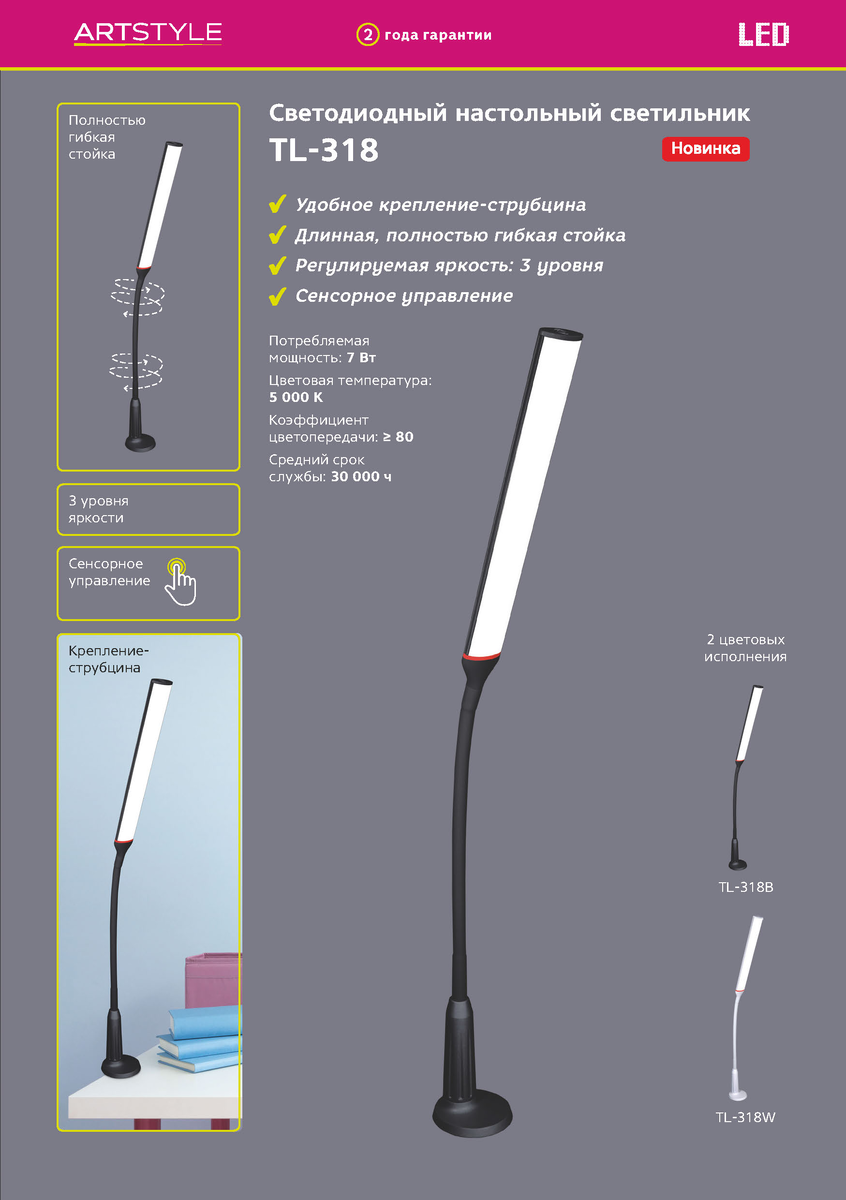 Настольный светильник Artstyle tl-318 крепится к поверхности при помощи струбцины, максимальная толщина стола не должна превышать 7 сантиметров, крепление вызывает доверие, пластик достаточно прочный. Длинная и полностью гибкая стойка позволяет направить свет в нужное место, при этом лампой можно управлять одной рукой, она сохраняет свое положение, не нужно ничего подкручивать и затягивать. Отличный вариант для подсветки мелких ручных работ, будь то пайка или например маникюр. Управление осуществляется при помощи все-лишь одной сенсорной кнопки, она расположена с торца плафона. Первое нажатие включает светильник, последующие увеличивают яркость свечения, четвертое нажатие выключает его. Потребляет он порядка 7 Вт в час, при этом дает столько же света, сколько и лампа накаливания мощностью 60 Вт. Свет нейтральный белый, цветовая температура составляет 5000 К. Этот светильник имеет встроенные светодиоды, они закрыты матовым рассеивателем. Светодиоды не требуют замены