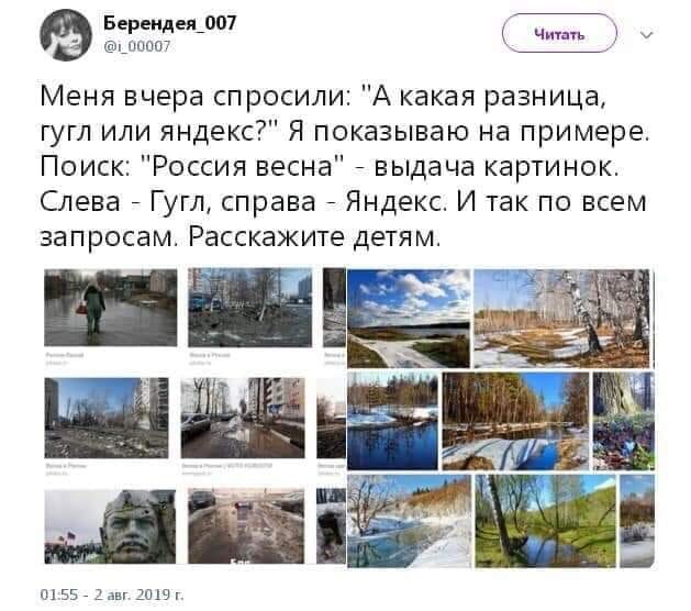 Вчера в ленте одной из своих соцсетей натолкнулась на такую штуку Ну думаю, а если проверить? Мало ли чего Путин-тролли напишут. Проверила. Яндекс выдаёт по запросу «весна в России» Гугл по тому же запросу Разница очевидна. В случае Яндекса яркая жизнеутверждающая природа, у Гугла грязный темный город. Но может у него всегда так? Перефразирую запрос на «весна в Америке» Яндекс Гугл В обоих случаях вполне себе симпатичные виды, прежде всего городские. Вот как то так ребята. Сама пользуюсь кстати для поиска именно Яндексом. Как привыкла к нему в начале века, так меня он вполне устраивает. Главное знать, что искать.