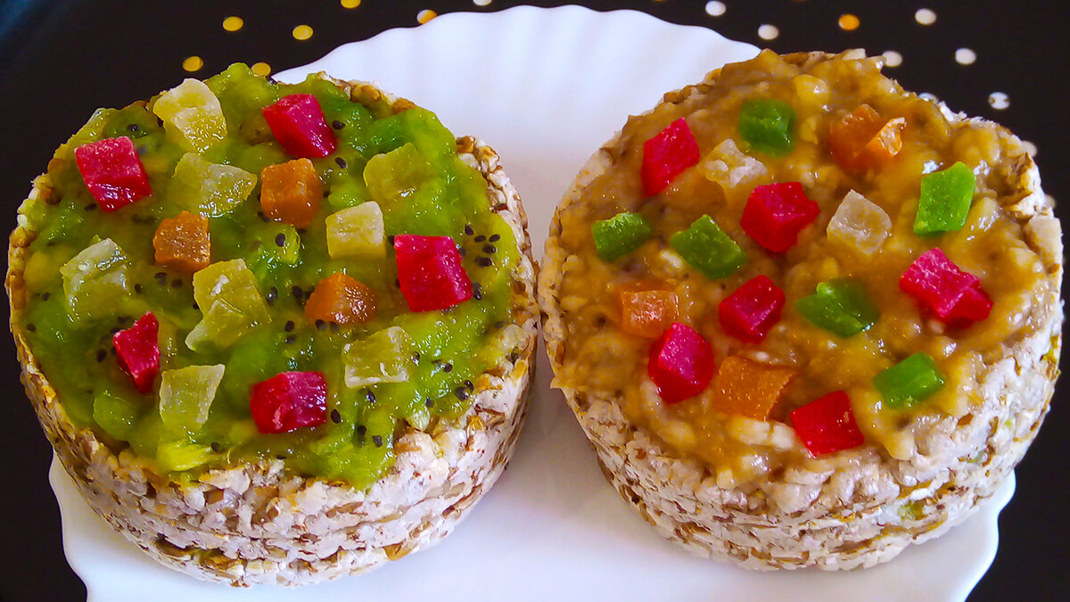 Успеваю приготовить пока кипит чайник. Время на готовку таких малокалорийных вкусняшек уходит 2-3 минуты. Готовить их можно с разной начинкой, на ваш вкус. Верх украсить любыми фруктами, изюмом, шоколадной крошкой, орехами. Т.е можно экспериментировать. Способ приготовления: Очистим один банан и нарежем его на кусочки Разомнем его вилкой Почистим два киви и нарежем на кусочки Также, как и банан, разомнем вилкой Для основы нашего десерта буду использовать сладкие клюквенные хлебцы. Можно приготовить и на других, по вашему вкусу Берем хлебцы - 3 шт. На два хлебца намазываем банановую смесь, а на третий - киви Собираем фруктовое пирожное: