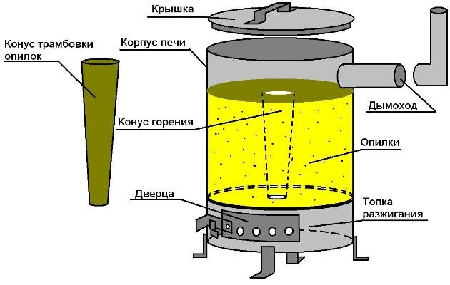 Как обогреть теплицу? Электричество дорого, да и не везде оно есть, а печурки типа «буржуек» требуют много дров и постоянного присмотра. Я предлагаю конструкцию печи, которая не требует обязательного неотлучного присутствия хозяина и работает на доступном и недорогом топливе - древесных опилках. Устройство печи показано на рисунке. Вот несколько дополнительных указаний по ее использованию: печь изготовляется из обычной черной жести (как и «буржуйка»); у нее два дна — в верхнем, по центру, делается отверстие с закраинами, в которое при заполнении печки опилками вставляется конусная труба; установив трубу-конус, в печь засыпают опилки, очень плотно их утрамбовывая, до верхнего уровня дымовой трубы; наполнив печь опилками, вынимают конус и закрывают крышку; в нижней части раскладывают дрова и поджигают их. Пламя и горячий дым, проходя через канал в опилках (образовавшийся после того, как вы вытащили конус), зажигают опилки, и они начинают тлеть, отдавая ровное тепло в течение 8—10 часов