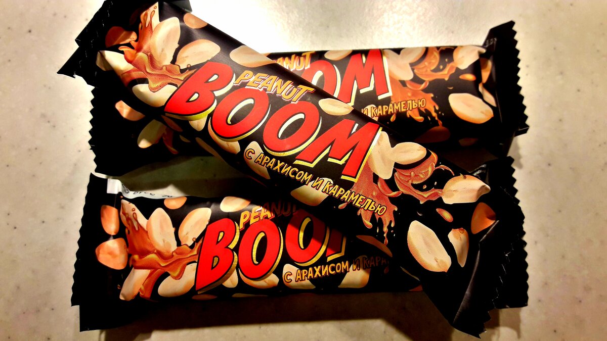 Здравствуйте, уважаемые подписчики и читатели! Сегодня представляю Вашему вниманию обзор шоколадного батончика "BOOM" с арахисом и карамелью. Купил я его со скидкой 50% в "Магните" за 7.45 рублей в пересчете на 1 кг цена 149 руб. Упаковка чем-то похожа на "Сникерс". Конфета с корпусом на мягкой карамельной основе глазированная батончик с арахисом. Состав: ядро арахиса жареное, глазурь кондитерская (сахар, заменитель масла какао (рафинированное дезодорированное пальмоядровое в натуральном и модифицированном виде, эмульгатор лецитин, сорбитан тристеарат), какао-порошок, сыворотка сухая молочная, эмульгатор соевый лецитин, ароматизатор), сахар, патока, масло пальмовое (масло пальмовое, антиокислитель концентрат смеси токоферола), сыворотка сухая молочная, молоко сухое цельное, агент влагоудерживающий сорбитовый сироп, эмульгатор соевый лецитин, соль, регулятор кислотности лимонная кислота, ароматизатор. На мой взгляд, ничего особо плохого в составе нет. Пальмовое масло, ароматизаторы.