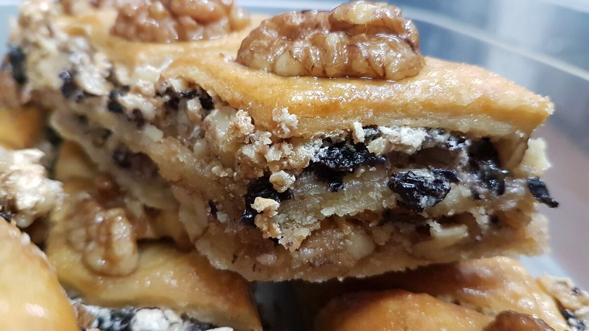 Здравствуйте уважаемые читатели! Моя хорошая знакомая, уже полюбившаяся многим из вас шеф-кондитер Юлдуз вновь готова поделиться одним из своих рецептов. Сегодня это будет грузинская пахлава. Начнем с состава: сливочное масло - 125 грамм; сметана - 125 гр; яйца - 4 шт; сахарный песок - 1 стакан; грецкий орех - 1 стакан; чёрный изюм - 1 стакан; разрыхлитель - 5 грамм; мука - 250 грамм. В самом начале надо протереть сливочное масло через тёрку с мукой. Это хороший способ их смешать. В эту же смесь добавим разрыхлитель. Отдельно перемешаем желтки со сметаной. Эту смесь перемешаем с первой мучной, так чтобы получилось тесто. Оно будет немного липкое. Уберем его в холодильник на 1 час. Тем временем займёмся начинкой. Белки яиц начинаем взбивать в блендере с щепоткой соли, потихоньку добавляя сахар. Взбиваем пока весь сахар не будет добавлен до пышной массы. Орехи и изюм можно немного порубить ножом и аккуратно смешать с белковой массой. Спустя час тесто можно достать из холодильника и