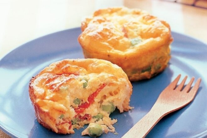 Смешайте салями, сыр и горох в средней миске. Разделите смесь равномерно между формами для кекса. Шаг 3