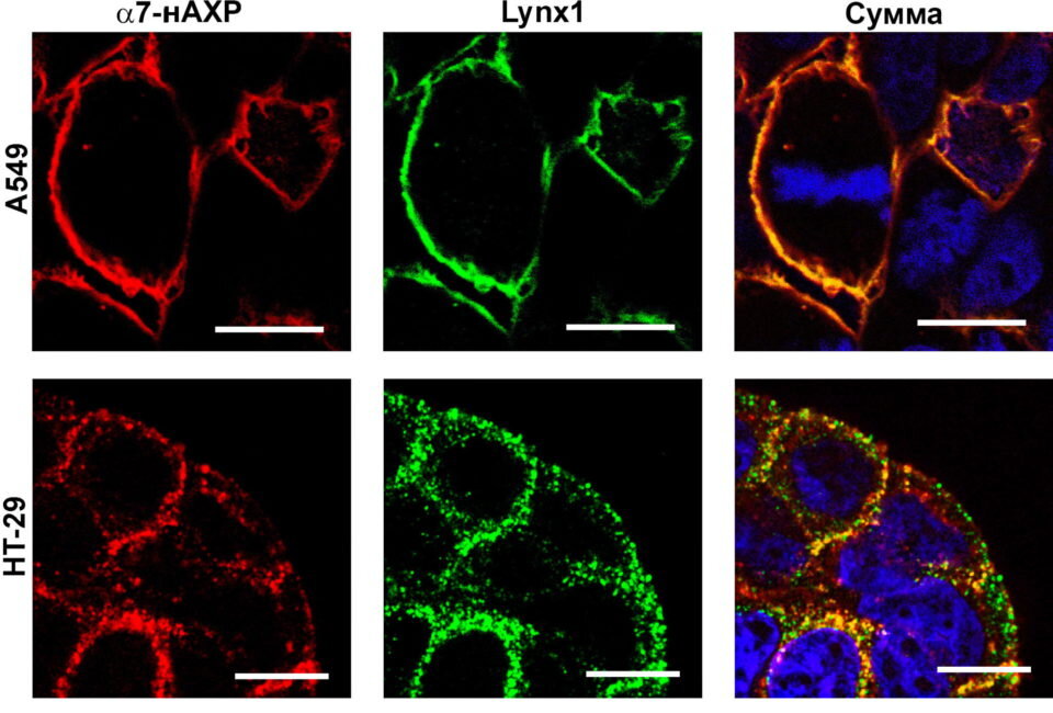 Регуляция нейрорецепторов может уничтожать клетки карциномы (рака) легкого. Исследование, показывающее такую возможность, было проведено группой ученых из ИБХ РАН и МФТИ. При обработке водорастворимой модификацией белка Lynx1 (регулятора никотиновых ацетилхолиновых рецепторов) происходит остановка деления клеток карциномы легкого и впоследствии их гибель. Проведенные опыты in vitro позволяют считать данный препарат потенциальным прототипом новых лекарств для лечения карциномы легкого. Статья опубликована в PLOS ONE. Солокализация белка Lynx1 (зеленый цвет) и α7-нАХР (красный цвет) в клетках рака легкого (A549) и прямой кишки (HT-29). Синим цветом выделены ядра клеток. Масштаб шкалы 10 мкм. Источник: Bychkov et al., PLOS ONE Никотиновые ацетилхолиновые рецепторы (нАХР) регулируют передачу сигнала в периферийной и центральной нервной системе. Однако они были найдены и в клетках эпителия и иммунной системы. нАХР определенного типа α7-нАХР, обнаруженные в раковых клетках, играют важную р