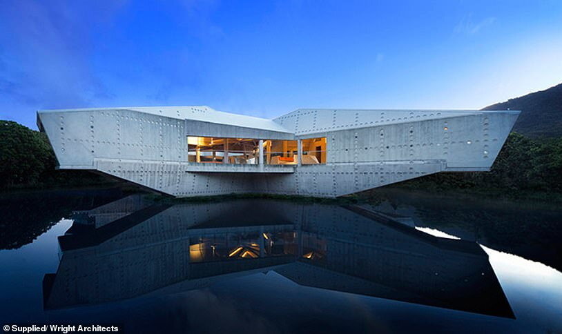 В диком тропическом лесу Квинсленда на северо-востоке Австралии в центре озера построено настоящее футуристическое чудо – жилой дом «The Stamp House», который способен успешно противостоять тропическим циклонам высшей 5-й категории. Нечто невероятно надежное Разработка проекта и строительство особняков в тропическом лесу, неподалеку от морского побережья, обязательно должны учитывать воздействие разрушительных тропических циклонов. И если заказчик в состоянии финансировать противоураганное здание, то появляются удивительно надежные и крепкие дома, способные успешно противостоять тропическим циклонам высшей 5-й категории. Итак, потрясающий бетонный особняк «The Stamp House» (Дом марок) был построен в 2013 году в центре озера в диком тропическом лесу Квинсленда на северо-востоке Австралии по заказу филателиста Рода Перри. Бассейн в центре дома имеет форму связанную со знаменитой австралийской почтовой маркой «One Pound Jimmy» на которой в 1950-х годах появился первый местный абориген.