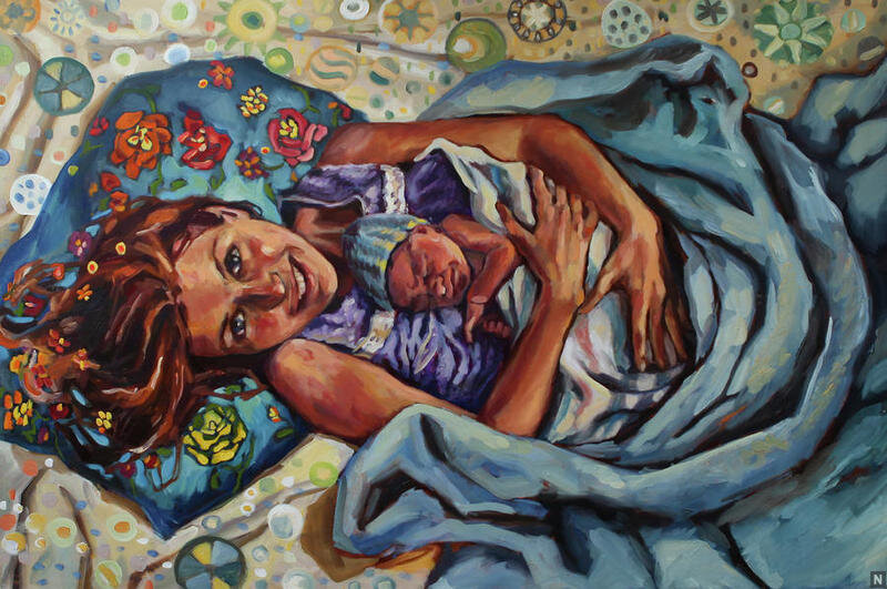 Схватки у меня начались еще днем, но я понятия не имела, что это они. Сходила на плановый прием к гинекологу (она с подозрением отнеслась к повышенному тонусу матки, но я сказала, что чувствую себя нормально, и от осмотра на кресле отказалась), потом дома порисовала, встретила мужа, покормила его ужином... и наконец поняла, что живот схватывает с некой периодичностью и все сильнее. Когда дошло до того, что на пике приходилось держаться за стенку, я вызвала скорую. Машины у нас тогда не было, и меня домчали на казенном авто, с мигалкой и на большой скорости. Доктор приняла меня очень душевно - как оказалось, мне повезло, и моего первенца принимала самая чудесная врач из всех, кто дежурил в роддоме. Она сказала, что к утру родим (я приехала туда в восьмом часу вечера и мягко говоря опешила), но все оказалось намного быстрее. Пузырь мне проткнули - его мне протыкали при каждых родах, но в первый раз это не возымело такого сильного эффекта, как во второй и третий.