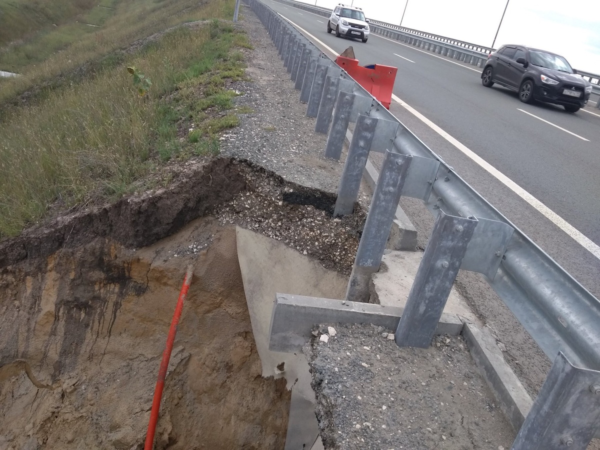 ЧП произошло в субботу, 3 августа. По сообщению пресс-службы ГУ МЧС по Самарской области, поступило сообщение о том, что в районе населенного пункта Береза сломалась конструкция отвода талых вод. Из-за этого размыло склон на Аэропортовском шоссе на площади около 30 метров и глубиной три метра. Погибших и пострадавших нет. Дорожное покрытие осталось целым. Фото обложки: Twitter.com/@Road163