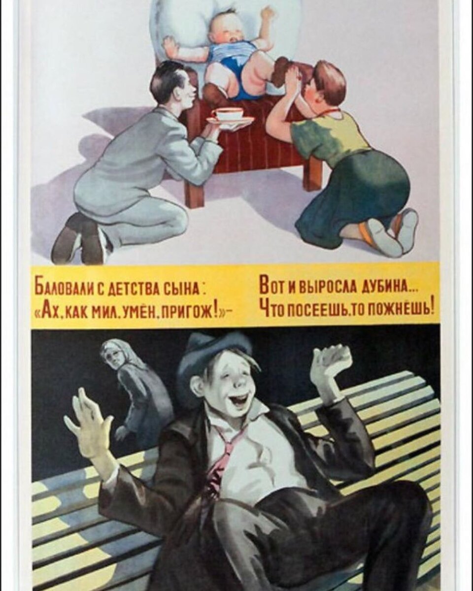 Меня сегодня спросили - где золотая середина? И прислали этот плакат из закромов советской пропаганды. Вопрос дня: баловать или держать в ежовых рукавицах? А корректен ли он? Ведь часто под "баловать" понимают именно то, то указано на плакате: «Хвалить, любить, находить слова поддержки». А "держать в ежовых рукавицах" значит - узнать про уроки, накормить и дать ремня «чтобы человеком вырос». К сожалению, иначе тогда могло быть лишь в единицах семей. Моего мужа отдали в ясли в 4 месяца. Потом забрали благодаря тому, что мама родила погодку и смогла с ними хоть немного побыть. А потом она просто пришла работать в эти ясли, лишь бы быть с ними. Меня мама отдала бабушке в 11 месяцев, чтобы не потерять работу и при этом не отдавать в ясли. А теперь представьте, если бы этим женщинам говорили о теории привязанности, о том, как важно видеть в ребёнке человека с эмоциями и чувствами, как важно проецировать это на себя? Да они бы рехнулись, сидя на работе. Напомню, что была ещё и статья за тун