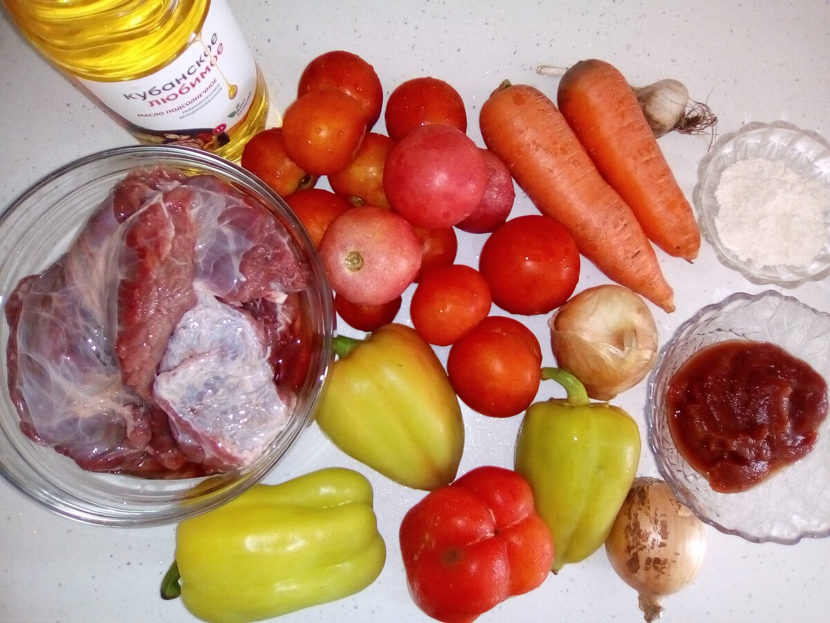 Попробовав один раз приготовить гуляш по этому рецепту, я удивился, насколько вкусное это блюдо. С тех пор всякий раз, когда удаётся купить хорошую говядину, готовлю этот гуляш. Отличительный его компонент – болгарский перец. Ингредиенты: Говядина (мякоть) – 1 кг Луковицы – 2 шт. Морковь – 2 шт. Болгарский перец – 500 гр. Помидоры – 700 гр. Томатная паста – 100 гр. Чеснок – 1 головка (небольшая) Мука – 1 ст. ложка Вода – 0,5 литра Растительное масло для жарки – 70 гр. Соль. Я беру много болгарского перца – все на фото не влезли. Также нужно большое количество помидоров, и для более насыщенного цвета я ещё добавляю томатную пасту (это не обязательно). Кроме того, в данное блюдо я не кладу специи – сочетание говядины, перца и чеснока и так дают потрясающий вкус и аромат. Готовить гуляш стану в скороварке, но при желании можно обойтись обычной кастрюлей. Приступим! Говядину промываю, режу кусочками. Удаляю все плёнки и жилы – так мясо гораздо мягче и вкуснее. Обжариваю говядину на сковор