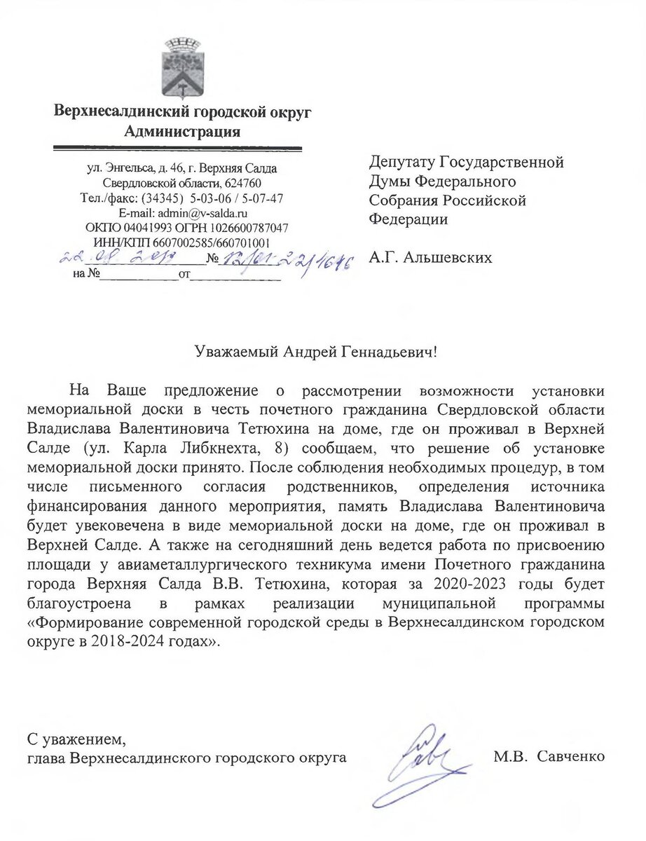 На доме, в котором Владислав Тетюхин жил в Верхней Салде, установят мемориальную доску. Муниципалитет взял на себя оргвопросы, в том числе заручится согласием родственников легендарного промышленника. Дополнительно администрация Верхней Салды анонсирует, что в честь Владислава Валентиновича назовет площадь возле авиаметаллургического колледжа. Светлая память нашему земляку!