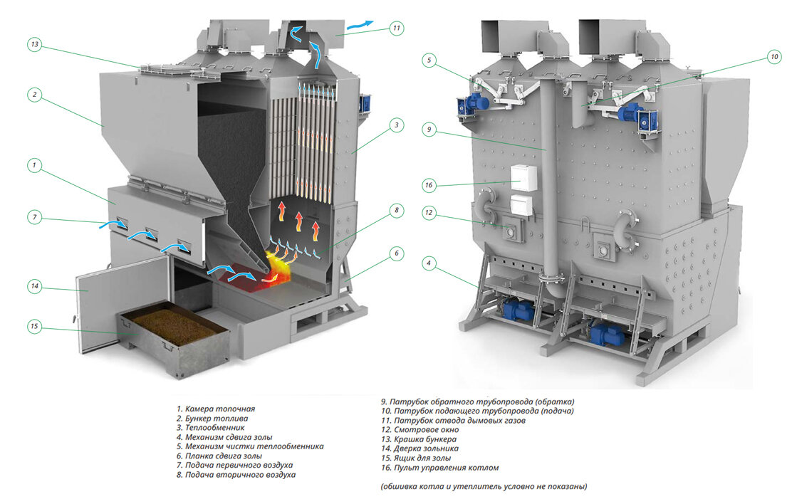 Котёл состоит из трёх основных разборных частей: механизированная топочная камера, теплообменник с механической чисткой и бункера. В процессе эксплуатации котла из загрузочного бункера в автоматическом режиме топливо поступает в механизированную топочную камеру, в которой происходит горение с последующим удалением перегоревших отходов в зольный контейнер. В котле отсутствует колосниковая решётка.