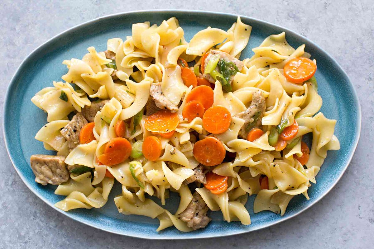 Легко, просто, быстро, вкусно. Ингредиенты: Знаете ли вы, что появлению вилки с четырьмя зубцами мы обязаны... макаронам. Считается, что ее придумал гроссмейстер короля Фердинанда II для удобства поедания макарон. Приготовление Макароны отварим до готовности или альденте. Сольем воду. Добавим ложку масла, чтобы макароны не слиплись. Отложим. Приготовим подливку. Для нее мясо нарежем тонкими полосками. Лук порежем кубиками. Морковь очистим и нарежем кружочками. В сковороде разогреем масло. Обжарим на нам свинину. Хозяйке на заметку Не нравится свинина? Замените ее говядиной, курицей или индейкой на свой вкус. Этот соус отлично сочетается с любым видом мяса.