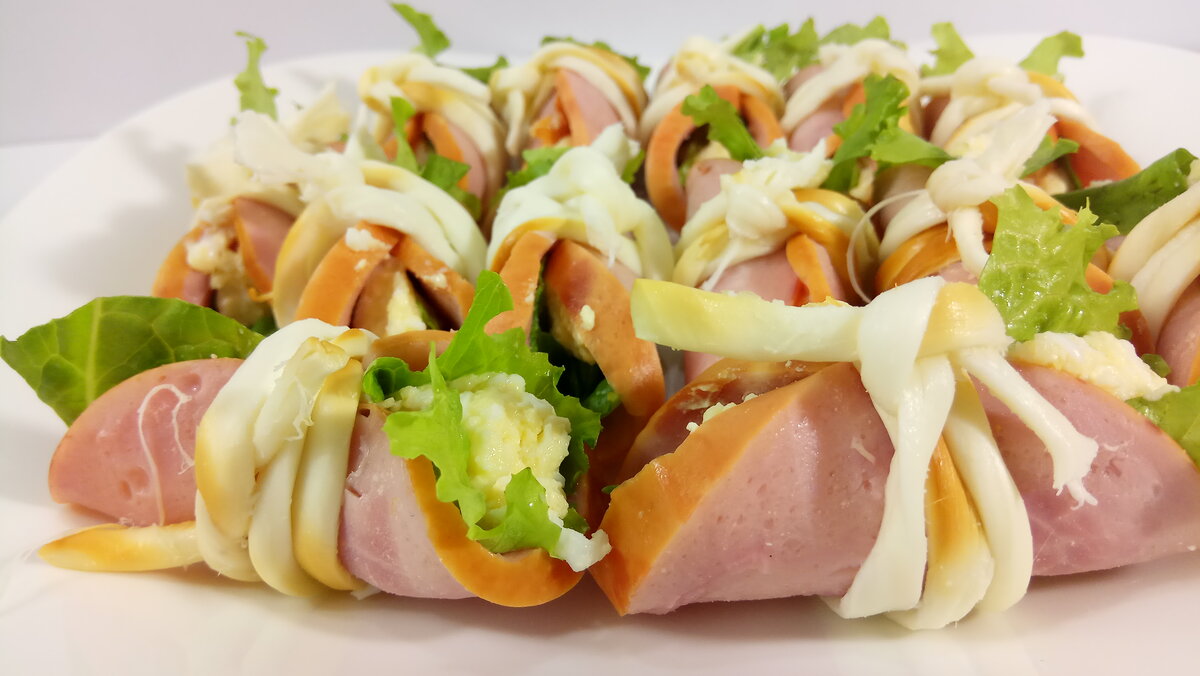 Салатные листья ПОШАГОВЫЙ РЕЦЕПТ ПРИГОТОВЛЕНИЯ Сыр натираем на мелкой тёрке, пересыпаем в миску, так же натираем 2 отварных яйца и пересыпаем к сыру, выдавливаем или натираем 2 зубчика чеснока, добавляем одну столовую ложку майонеза и хорошо перемешать. Сырная масса готова и мы её отставляем в сторонку. Берем салатные листья и разрезаем на небольшие кусочки. На сырную косичку выкладываем ломтик ветчины, небольшой салатный листик и сырную начинку. Подпишитесь на мой канал Ольга Лунгу Сворачиваем рулетик и завязываем копченым сыром из косички. Готовую закуску перекладываем на блюдо и отправляем в холодильник, чтобы остудить. Рулетики из ветчины готовы, можно ставить на любой праздничный стол и так же подойдет на новогодний стол. Она получается очень вкусная и понравится вашим гостям. Если Вам понра