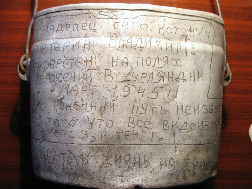 Два года назад был обнаружен этот солдатский немецкий котелок. Надпись на нём удивила всех видавших виды любителей истории ВОВ. "ВЛАДЕЛЕЦ СЕГО КОТЕЛКА ТЕТЕРИН ВЛАДИМИР! ПРИОБРЕТЕН НА ПОЛЯХ СРАЖЕНИЙ В КУРЛЯНДИИ МАРТ 1945 Г. ЕГО КОНЕЧНЫЙ ПУТЬ НЕИЗВЕСТЕН ВВИДУ ТОГО, ЧТО ВСЁ ВИДОИЗМЕ- НЯЕТСЯ, И ТЕЧЕТ. ------------------------------------------------------------ ЗДРАВСТВУЙ ЖИЗНЬ НА ГРАЖ (вероятно ГРАЖДАНКЕ)" Чем удивителен этот случай? Во-первых, человек написал, где именно этот котелок попал к нему в руки Во-вторых, человек очень хочет дожить до конца войны, он переживает что "всё видоизменяется", т.е. погибнуть он может в любую минуту. В-третьих, у бойца полно оптимизма, планов на послевоенную жизнь "Здравствуй жизнь на гражданке!" Искренне надеюсь, что солдат дожил до конца войны, ведь Курляндская группировка немцев оказала самое серьезное сопротивление и капитулировала только 10 мая 1945 года, то есть после официальной капитуляции фашистской Германии. А вот этот алюминиевый котелок