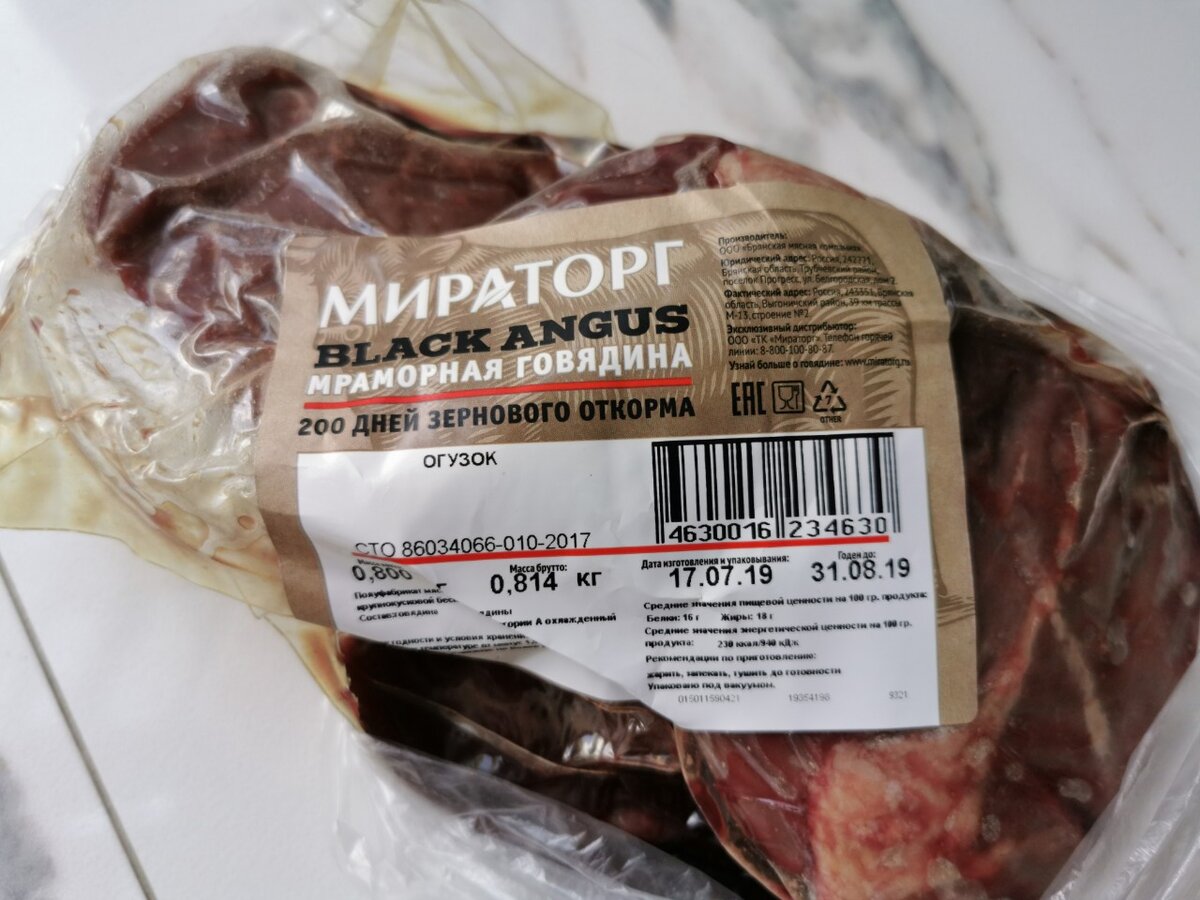 Дорогие любители стейков, как и Вы регулярно покупаю говядину Мираторга, чтобы порадовать себя и гостей хорошими стейками. В очередной в магазине Окей г. Воронеж, попал на акцию на стейки от Мираторга. Свежее мясо насыщенного цвета в плотно запечатанной вакуумной упаковке. Купил несколько штук: Огузок, Мякоть бедра и Мякоть лопатки по цене 600-750 руб/кг. Цена приемлемая, если обычная говядина стоит в среднем 550 руб./кг... Срок годности ~1,5 месяца. Примерно через неделю после покупки утро началось с нереального зловония - супруга решила приготовить на завтрак стейки. Мясо в упаковке болталось - я подумал, что герметичность нарушена - могли случайно проткнуть когда нес домой продукты... При надрезе вакуумной упаковки пошел нереальный трупный запах! Сок бледно зеленого цвета. Мясо сразу выкинули и еще долго проветривали помещение... Реально подумали, что сами повредили упаковку и испортили мясо... Но история повторяется! Вчера решил приготовить гостям стейки. Лезу в холодильник и до