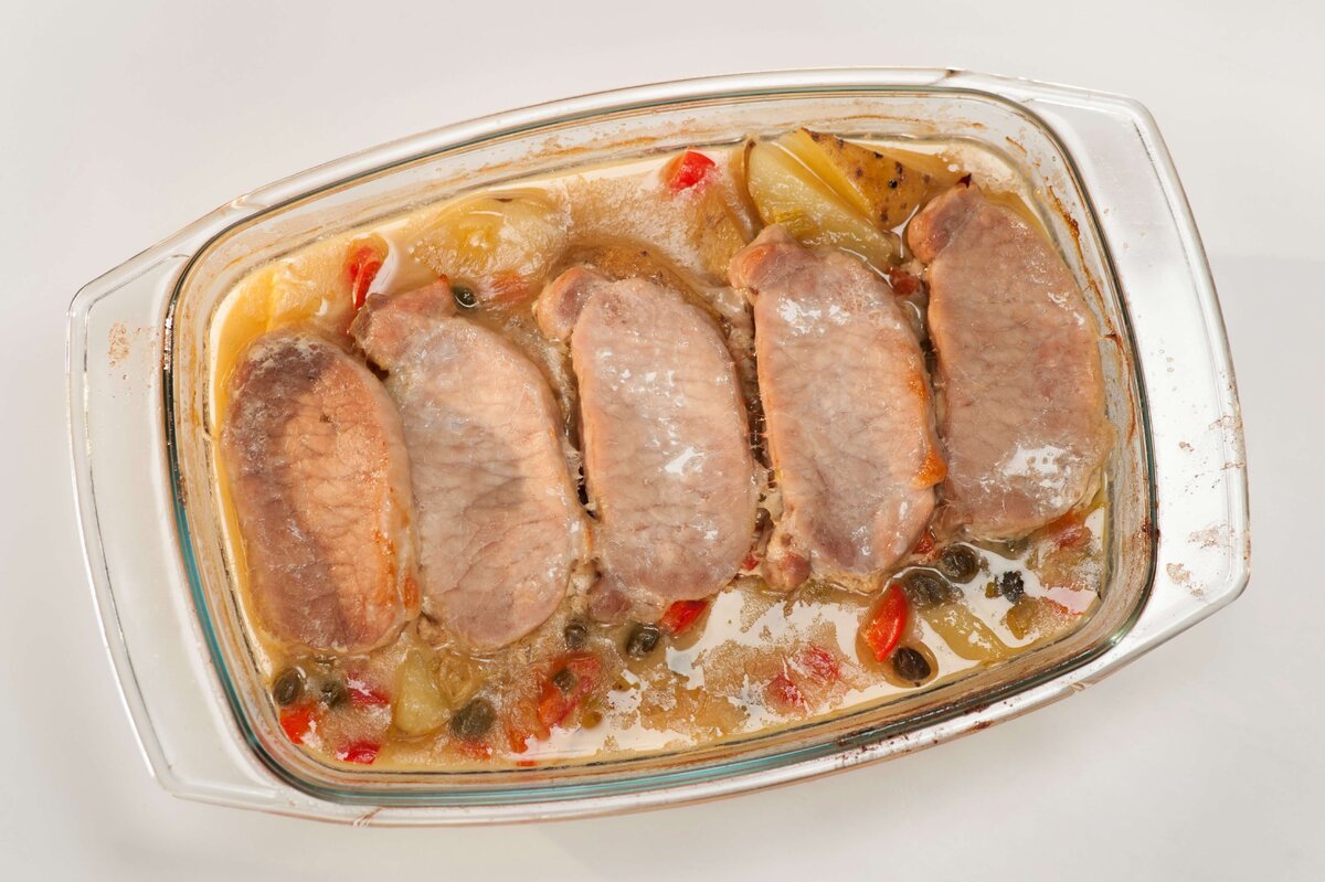 корейка свиная — 500 г Способ приготовления 1. Нарезаем крупно картофель, не очищая. 2. Разводим с водой горчицу, добавляем растительное масло. Солим, добавляем сахар и измельчённый зелёный лук. 3. Нарезаем сладкий перец средним кубиком, добавляем к горчице. 4. Заливаем горчичной смесью картошку, добавляем каперсы. Перекладываем картошку с маринадом в форму для запекания. 5. Нарезаем свинину широкими ломтями и выкладываем поверх картофеля. Солим, сбрызгиваем растительным маслом. Накрываем форму фольгой и отправляем в духовку, разогретую до 180 градусов, на 1 час. 6. Снимаем фольгу за 10 минут до окончания приготовления и возвращаем блюдо в духовку, чтобы свинина подрумянилась. Свинина на пикантной картошке готова. Приятного аппетита! Еще больше рецептов на сайте tveda.ru Любите читать Дзен Телеканала «Еда»? Расскажите свое мнение о материале в комментариях и ставьте лайки