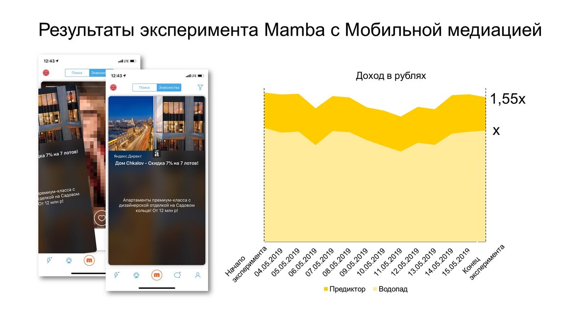 Эксперимент с платформой Мобильной медиации от Яндекса позволил владельцам мобильного приложения знакомств Mamba увеличить доход от монетизаторов в разных рекламных блоках в среднем на 30%. Mamba — популярное мобильное приложение для знакомств с аудиторией более 40 миллионов пользователей из более чем 50 стран по всему миру. Приложение бесплатное и получает доход от размещения рекламы. Как проходил эксперимент В течение двух недель разработчики приложения тестировали разные подходы мобильной медиации: классическую модель «лесенки», или «водопада» и Мобильную медиацию от Яндекса с системой подбора порогов. Ключевая цель эксперимента — сравнить эффективность моделей подбора монетизаторов и увеличить доход от рекламных блоков в мобильном приложении. Эксперимент проводился в приложении на нативных баннерах. При этом половина запросов к монетизаторам проходила по модели водопада, а вторая — через систему подбора порогов. С помощью Мобильной медиации настроили монетизацию в приложении от Р