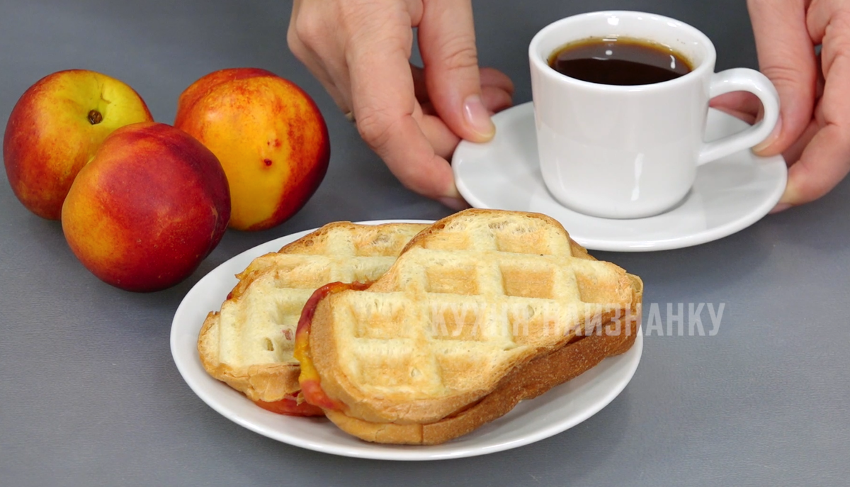 Завтрак - это обычно что-то быстрое, легкое и вкусное. Именно это и привлекло меня в данном рецепте. Рецепт прислала моя подписчица, за что мы уже месяц ее благодарим)) Пробовала такие сэндвичи с разными фруктами - вкуснее всего с абрикосами и с персиками. В видео ниже я показала, как готовлю такой завтрак. Там же еще полноценный обед и ужин. Посмотрите - вам понравится)) Вначале нужно нарезать хлеб. У меня сегодня батон, но, конечно, любой белый хлеб подойдет. Из нектарина удаляю косточку. Фрукты, как я уже и говорила, можно взять любые. Но желательно, чтобы они были сочные и кисло-сладкие. Разрезаю каждую половинку нектарина еще пополам. Такого нектарина хватает как раз на два бутерброда. Один ломтик хлеба посыпаю сахаром. Выкладываю на него фрукты. А сверху накрываю вторым ломтиком хлеба. Выкладываю бутерброды в разогретую вафельницу и хорошо прижимаю. Если нет вафельницы, можно использовать электрический гриль, например. Прижимаю и готовлю 2,5 - 3 минуты. Мне этого времени достато