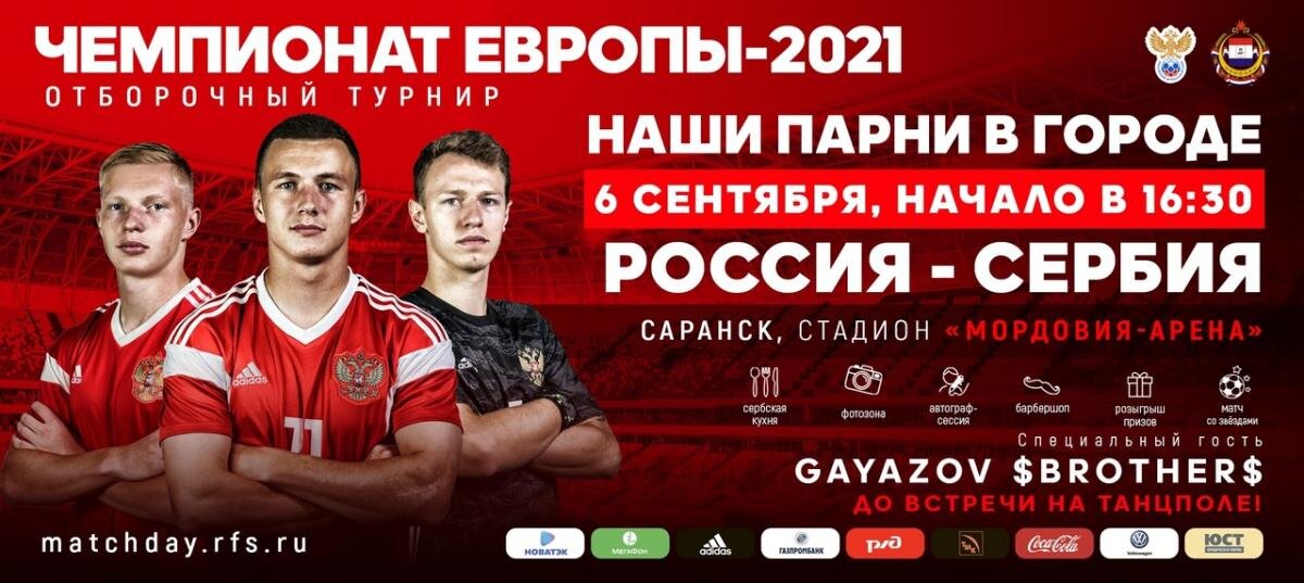 6 сентября в Саранске на стадионе Мордовия-Арена состоится матч молодежных футбольных сборных России и Сербии. Российский футбольный союз приготовил по случаю футбольного праздника масштабную развлекательную программу. Центром мероприятия станет площадь Мордовия-Арены. Здесь болельщики смогут сразиться в футбольном поединке с послами сборной России, возглавит которых Андрей Тихонов. Также каждый желающий сможет попробовать блюда национальной сербской кухни и посмотреть выступление рэп-группы GAYAZOV$ BROTHER$. Также болельщикам предложат сделать бесплатную стрижку в барбер-шопе и отправить открытку с посланием для главного тренера сборной России Станислава Черчесова. Матч Россия-Сербия открывает для нашей сборной европейскую квалификацию. Начало встречи запланировано на 19-00. Российская молодежная команда прибудет в столицу Мордовии в боевом составе, в котором выделяются участники недавних квалификационных матчей Лиги чемпионов и Лиги Европы УЕФА в составах "Краснодара" и "Спартака