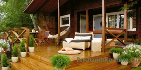 Веранда на даче - это один из важных элементов расширяющих полезную площадь постройки. В теплое время, года, прячась от солнца, на веранде приятно пить чай и любоваться цветением собственного сада. Веранда представляет собой сезонное не утепленное помещение, простое по конструкции. Грамотное обустройство веранды, великолепно украсит и дополнит жилище. Если знать принципы правильного обустройства веранды на даче, при небольшом размере дома она сможет стать прихожей столовой и одновременно со всем зоной отдыха. Есть несколько важных советов по обустройству веранды: Оборудуйте вашу веранду камином, он прекрасно украсит помещение, и поможет согреться в холодное время. Обустройство веранды камином показано на фото. Мебель для веранды подбирайте таким образом, чтобы ее можно было легко переставить в дом или сад. Отлично для этого подходит плетенная мебель. Все крупные предметы интерьера, а именно, посудные шкафы, полки, гардеробы, лучше всего разместить вдоль глухой стены - это позволит виз