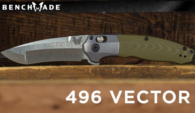 Benchmade, Inc. объявили о появлении в продаже с 20 сентября новой высококлассной модели складного ножа 496 Vector, оснащенного первым в ассортименте компании клинком с комбинированной формой спусков и нацеленного на сферу повседневной эксплуатации и переноски (EDC). Схожий по размерам с предшествующей 495-моделью нож оснащается симметричным 9,1 см клинком гибридной формы из CPM стали 20CV. Длинный изогнутый основной участок лезвия переходит в вогнутые спуски, а в закругленной области кончика, расположенного почти по центру, - в прямые с увеличенной толщиной. По большей части сточенный изогнутый обух сохранил свою толщину в месте упора большим пальцем, а также по центру клинка. Открытие вращающегося на оси клинка производится нажатием на выступающую в сложенном положении из рукоятки "гарду-плавник" (флиппер), идущую сразу за вытянутым изгибом перед лезвием (дульки), упрощающим правку и заточку. Вспомогательная система доводки не потребует развития большого усилия, а для фиксации в откр