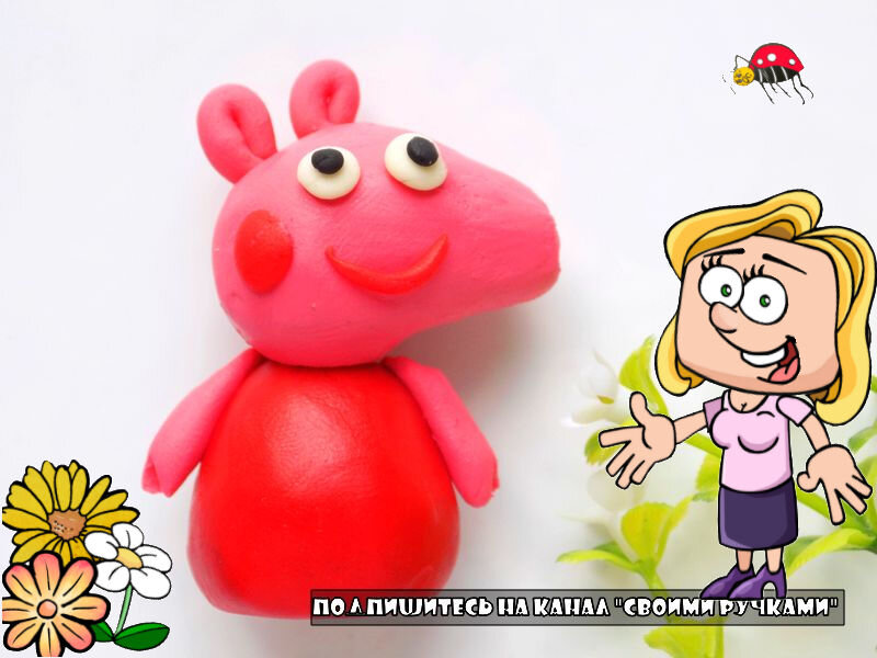 Добавим улыбающийся рот, это будет жгутик, скатанный из красного пластилина, а также щечку. Наша свинка Пеппа из пластилина готова. Фото 12.