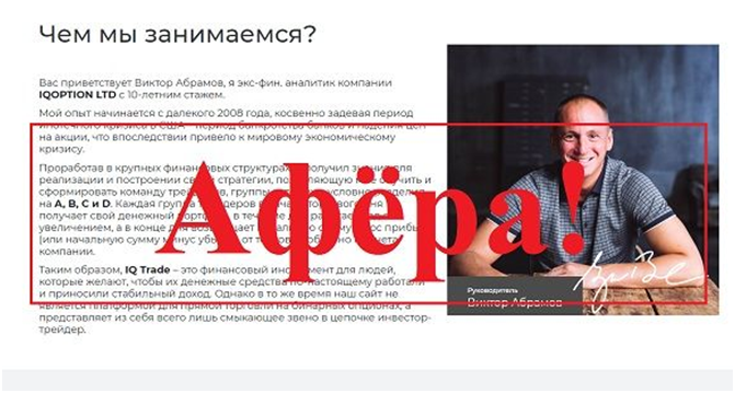 Многие путешественники мечтают о работ в интернете, приносящей солидную прибыль и позволяющей «быть на плаву» в дальних странах. Этим пользуются всевозможные мошенники, имеющие ту же цель и решившие заработать именно на вашем желании. Но есть в рунете и люди, разоблачающие этих мошенников и помогающие простым людям ориентироваться на просторах интернета. Мошенничество с Iq trade… Суть проекта Виктор Абрамов, бывший финансовый аналитик компании IQOPTION LTD (ложь!), предлагает фантастический заработок в размере от 103% всего за три дня. Виктор, обучил какое-то количество трейдеров, которых он разделит на четыре группы: A, B, C и D. Эти трейдеры каждый день получают «денежный портфель» и начинают торги. В конце дня они сдают прибыль или отчёт о потерях. При этом Абрамов заявляет, что сайт iqtrade.ltd не является платформой для торговли, а лишь «смыкающее звено в цепочке инвестор-трейдер». Зато, ресурс www.iq-trader.com как раз таки предназначен для торговли. При этом на сайте продаю