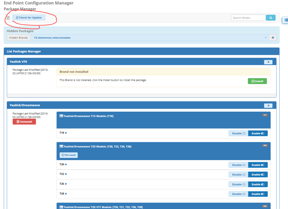 Появятся список всех доступных производителей и поддерживаемые модели телефонов. Жмем Install на против нужных производителей. Когда все установится включите нужные модели телефонов, в моем случае это yealink.
