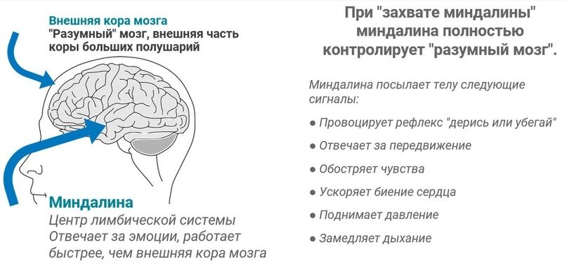 Например, вы увидели в чаще леса медведя и испугались. Скорее всего, вы еще не успели обдумать, что это медведь, он сильный и страшный, надо как-то избежать опасности. А миндалевидное тело уже дало команду бежать или сражаться. На деле мозг отправляет одинаковые сигналы об опасности и в миндалевидное тело, и во фронтальную кору, которая отвечает за осознанные решения. Но центр реакции на стресс действует в этой ситуации быстрее и просто перекрывает сигналы фронтальной коры.