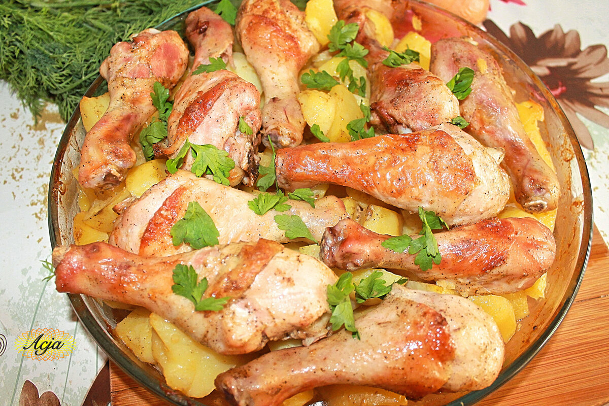 Всем привет. Сегодня готовлю куриные голени с картофелем, запеченные в духовке. Это хорошее решение для обеда или ужина. Готовится несложно и не требует особых навыков. СОСТАВ: ✔куриные голени - 800 гр. ✔сметана - 1 ст.ложка ✔горчица - 1 ч.л. ✔соль - 1 ч.л. ✔черный перец - ½ ч.л. ✔приправа для курицы -½ч.л. ✔картофель - 800 гр. ✔соль - 1 ч.л. ✔паприка -½ч.л. ✔растительное масло -2-3 ст. л. Подготовим голени. Хорошо промытые ножки отправляем в миску, добавляем 1 стол. л. сметаны, 1 ч.л. горчицы, солим, добавляем черный перец и приправу для курицы. Хорошенько перемешиваем и убираем в холодильник. Картофель очистить и порезать на довольно крупные брусочки. Перекладываем в миску, солим, добавляем ½ ч.л. паприки, растительное масло и всё хорошенько перемешиваем. На смазанную маслом форму разложить картофель в один слой, сверху куриные ножки и ставим в нагретую до 190 градусов духовку на 35-40минут. Как только голени подрумянятся, переворачиваем и ставим в духовку минут на 40, до пол