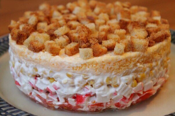 майонезом и украшаем сухариками.