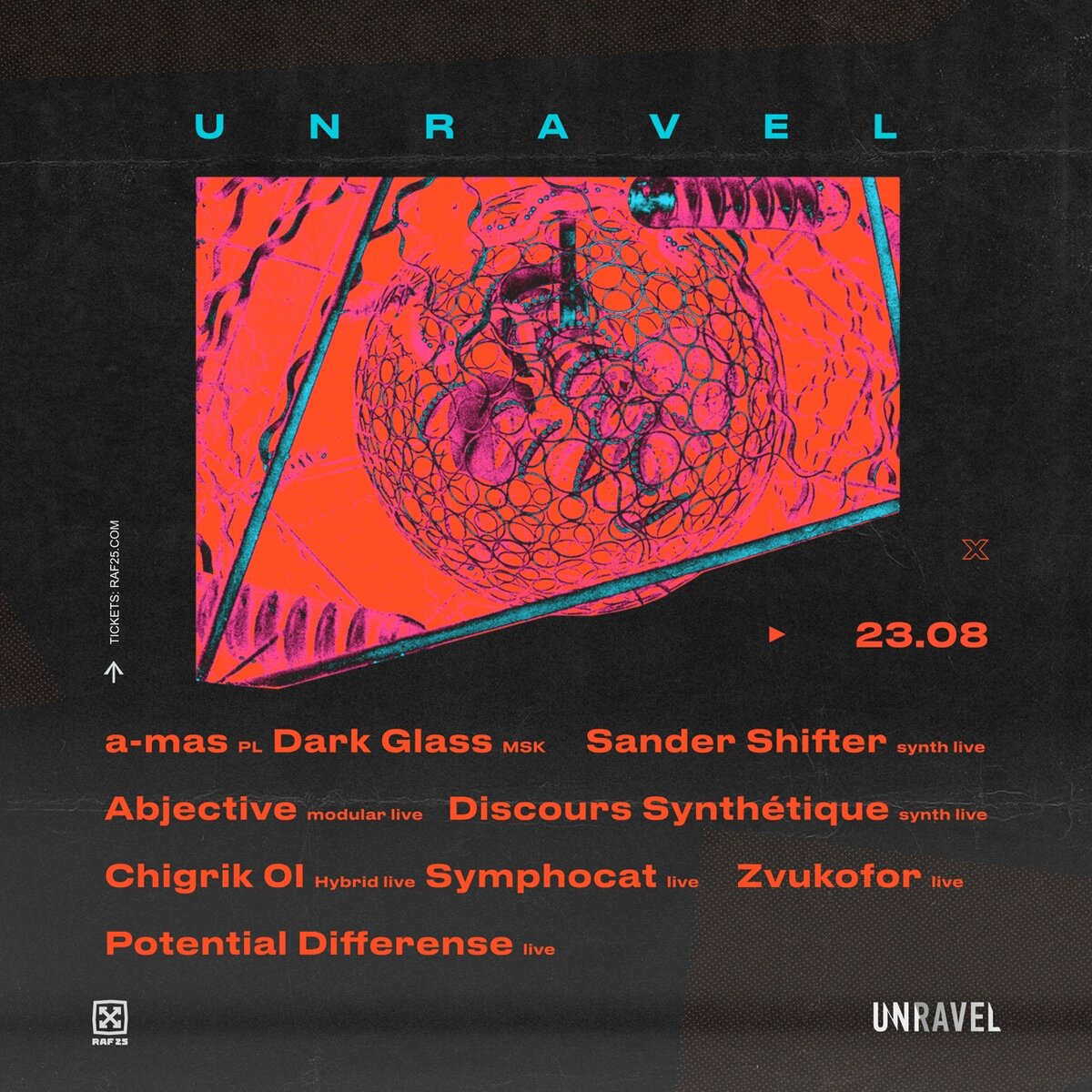 Тектонический разрыв в бомбоубежище ##### Уже в пятницу 23 августа в бомбоубежище RAF25 впервые пройдёт Unravel Sessions#1, в рамках которого свои релизы презентуют польский генеративный-инкогнито a-mas и Dark Glass c новым релизом из Москвы. Широкую поддержку живыми выступлениям им окажут избранные представители российского электронного андерграунда. Будет очень контрастная ночь. Словно тектонический разрыв внутри бомбоубежища, с лучшей атмосферой самыми модными людьми этого города. Да и еще забыли, чуть не забыли; во втором зале бункера будет представлена генеративную инсталляцию от Amach'i.