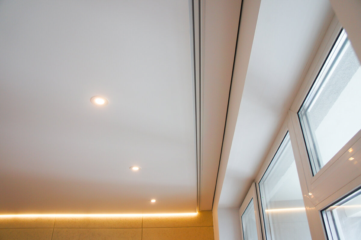 На этом объекте мы использовали новый теневой профиль #EuroKraab и профиль-карниз ПК-15. Получилось просто, красиво и технологично. Посмотрите, натяжной потолок выглядит, как гипсокартон, только есть несколько значительных отличий: