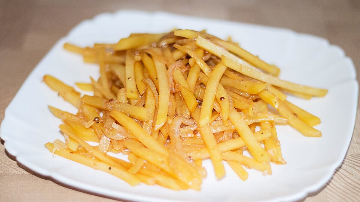 Очень часто говорят, что те блюда, которые мы готовим из корейской кухни, не имеют к ней никакого отношения. Отчасти это верно, отчасти нет. Любые рецепты выходя за пределы своей страны адаптируются. Некоторые приправы трудно, а то и невозможно купить, некоторые имеют совершенно непривычный для нас вкус. Вполне естественно, что люди подстраивают под себя те или иные рецепты. Я не вижу в этом ничего плохого. Один раз, когда муж работал в греческом экипаже, я приехала к нему на судно. И повар грек, желая сделать приятное, приготовил для меня русский салат (как ему казалось). Русская, в этом салате, была только картошка. Меня это нисколько не оскорбило. Я понимала, что человек старался, тратил время и силы и мне было это приятно. Поэтому, когда я готовлю рецепт корейской кухни, я понимаю, что это русская корейская кухня. Картофельный салат по-корейски Камди Ча Картофель желательно нарезать тонкой красивой соломкой, для этого есть много разных приспособлений. В конце концов есть кухонный