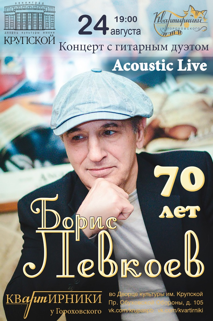 Квартирники у Гороховского и Дворец культуры им.Крупской приглашают отпраздновать 70—летие Бориса Левкоева! Праздничный концерт с гитарным дуэтом Acoustic Live! Приходите поздравлять и наслаждаться!