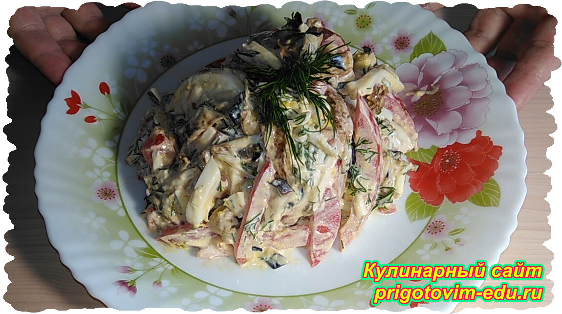 Салат из баклажанов с помидорами и яйцом с плавленным сыром