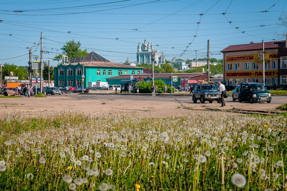 В Смоленске я бывал уже много раз. Созерцал его и зимой, и летом, и в межсезонье. Видимо, поэтому, приехав сюда в очередной раз, я не пытался фотографировать его налево и направо, а просто гулял, спрятав камеру в рюкзак. В Смоленске, как и в любом другом городе, полно трэша, о котором мы сегодня постараемся не вспоминать. А в этот раз прогуляемся вдоль крепостной стены, которая является одной из главных достопримечательностей города. Смоленск – отличный вариант для путешествия выходного дня. Приехали мы сюда из Москвы на «Ласточке», которая долетает из столицы за 4 часа. Обратно на следующей уехали таким же нехитрым способом. Так, вот, оказались мы на Привокзальной площади, усеянной одуванчиками, сразу же полюбовались знаменитым смоленским Успенским собором и двинулись в сторону Днепра. В узком кругу моих знакомых слово «смоленск» после поездки сюда в марте стало нарицательным, и обозначает – грязь в различных её проявлениях. На подходе к мосту через реку Смоленск напомнил об этом :)